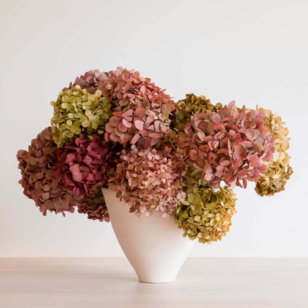This stunning combination is an effortless way to bring sculptural beauty and colour into any space. With their naturally rounded heads and velvety petals in soft autumn and blush tones, these blooms create a striking focal point.